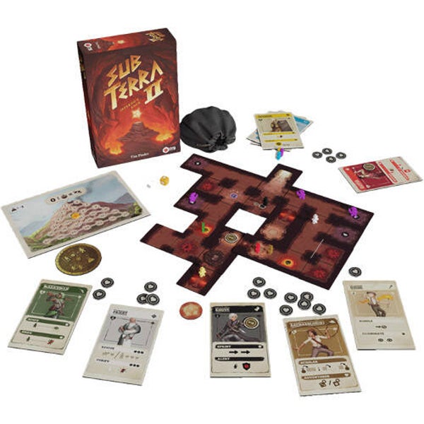 In Sub Terra II: Inferno's Edge, players will be progressively revealing new tiles, forming the board, mapping the volcanic temple from its sunlit entrance to its fiery core. As players explore through the temple, they will have to overcome obstacles, avoid hazardous terrain, and face the ferocious guardians of the 'artifact'. On each player's turn, after taking their actions, a random hazard will activate, making careful planning of actions essential to survival.