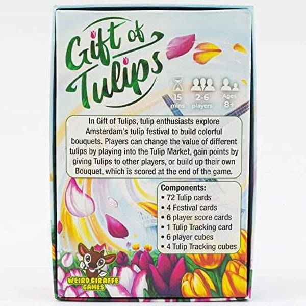 In Gift of Tulips, tulip enthusiasts explore Amsterdam's tulip festival to build colorful bouquets, give tulips to others (scoring points in the process), and manipulate the value of the market.