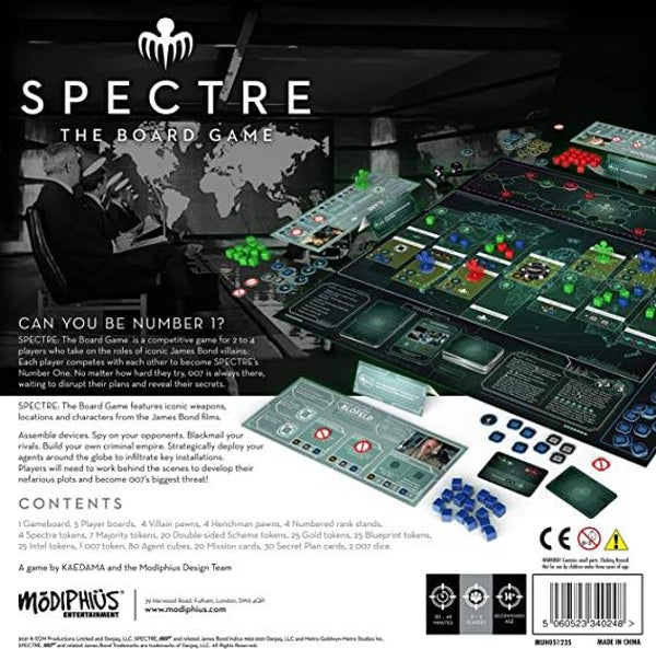 SPECTRE: The Board Game features iconic weapons, locations, and characters from the James Bond films. You will be able to assemble devices, spy on your opponents, blackmail your rivals in order to build your own criminal empire, and strategically deploy your agents around the globe to infiltrate key installations. You need to work behind the scenes to develop your nefarious plots and become 007's biggest threat, so grab your Persian cat and call your favorite henchman as you prepare your newest monologue — it's time to get down to business and start building that moon base and world-destroying megalaser.