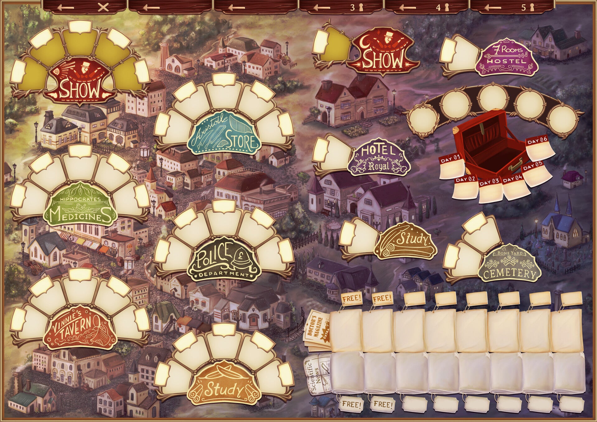 The game takes place over six days (rounds). At the start of each day, players prepare their schedules by booking time slots at locations around town, then the day's events happen according to these schedules. Players will gather medicine and equipment, employ accomplices, bribe the police, and perform shows — but not all plans run smoothly. Other players will create stock shortages, steal your audience, and snatch up those essential time slots! Performing shows in related sets grants fame bonuses, as does getting your name in the local newspapers. Grave-robbing in the night damages your reputation, but earns cash! At the end of a busy week, the player who has earned the most fame wins.