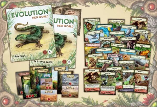 Evolution: New World is an updated and extended version of the basic Evolution: The Origin of Species game. It includes both well-known animal traits and new ones, complete with refined descriptions and colorful illustrations. Food is now generated using Area cards, and animals can use shelter to hide from predators.