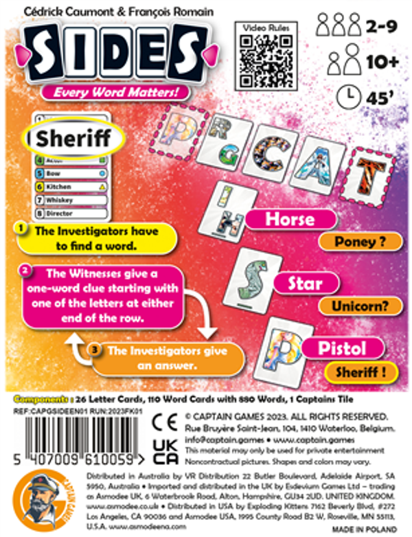 The objective of the game is simple: Each round, help two detectives find a mystery word. To do so, the other players (the witnesses) give detectives a one-word clue that starts with the letter at either end of the letter-card line.