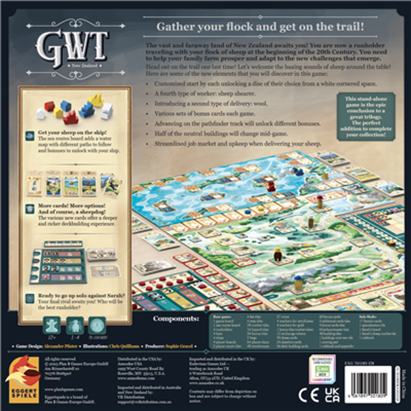 In Great Western Trail: New Zealand, you are a runholder — that is, the owner of a sheep station — on the South Island of New Zealand at the end of the 19th century. Recent years have seen your family farm prosper by diversifying your breeds of sheep and by increasing the value of your wool.