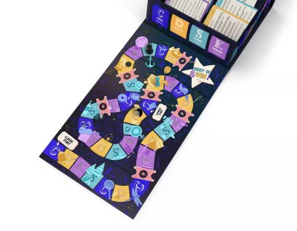 Draw a card matching the space you’re on. Then move your piece as far forward as the difficulty you set… if you get the answer right.