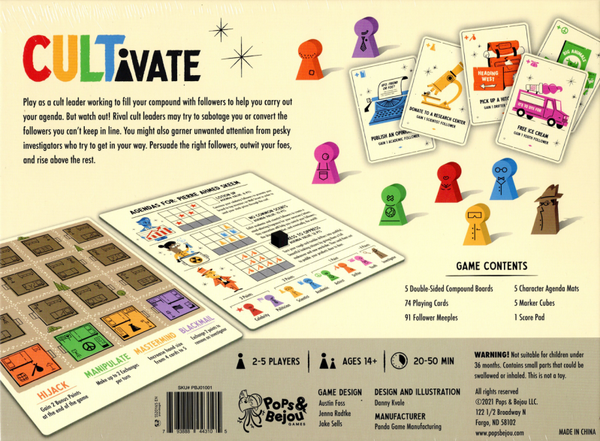 In the game CULTivate, you work to collect follower meeples needed to match the pattern of your character's agenda. Play cards from your hand allowing you to gain followers, manage follower placement within your compound, and sabotage rival cult leaders.