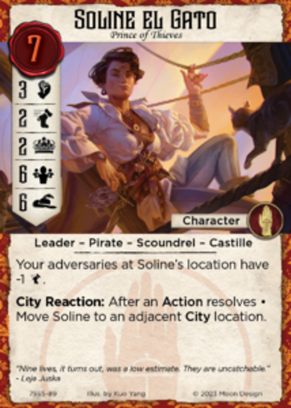 During the game, each player represents a leader who, along with their allies, explore locations and fight both with swords and with wits for overall influence over the city. Along with each player’s individual deck, 7th Sea: City of Five Sails also includes an element of randomness in the form of a separate, shared deck that represents the city itself with unusual characters, items, and events that change the focus of the game. Combat is resolved in a unique “back and forth” style reminiscent of challenging swordplay.