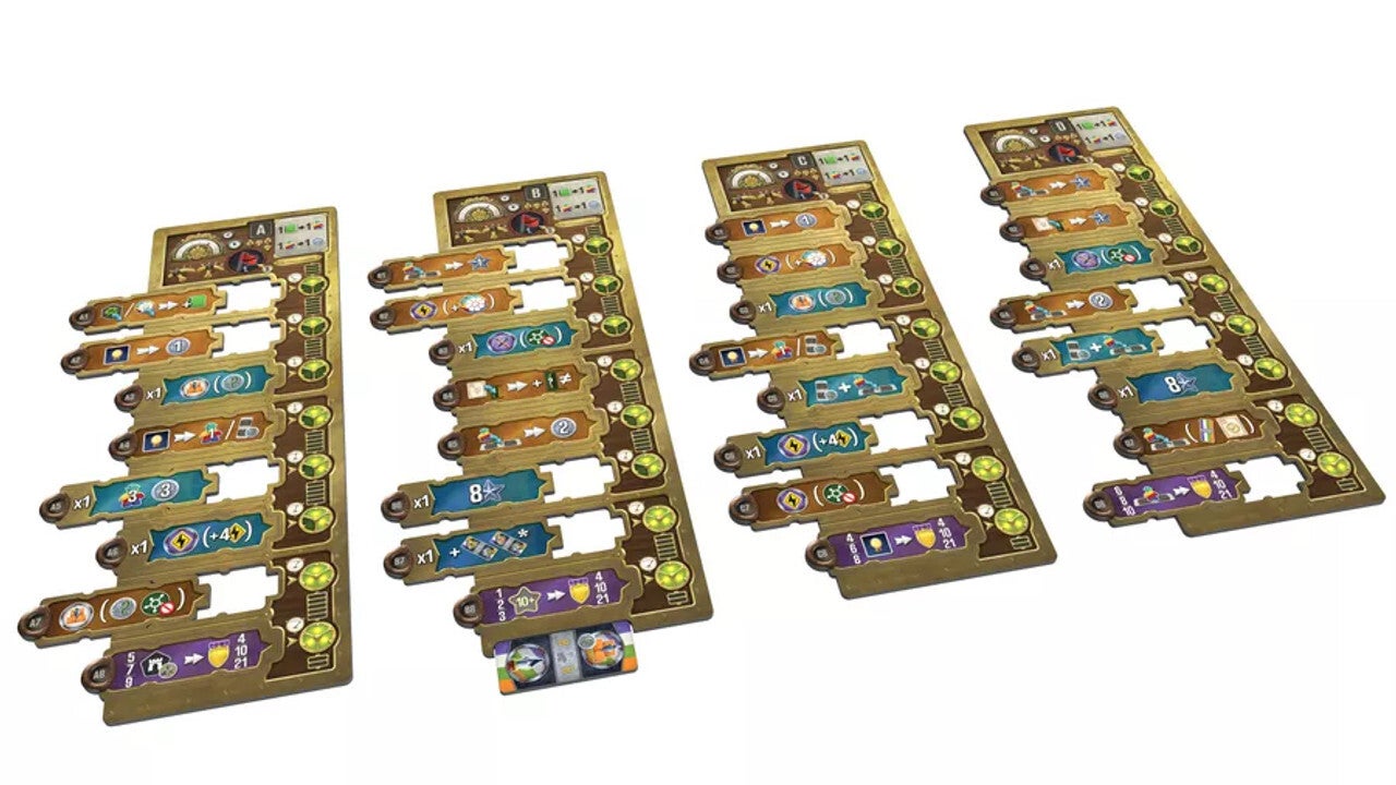 Players earn victory points by developing their networks, building and powering urban buildings, securing contracts, and meeting milestones (randomized endgame goals). Each player also gets unique asymmetric technologies, giving them special powers when unlocked. Gameplay is continuous; players take turns one after another with no rounds or phases.