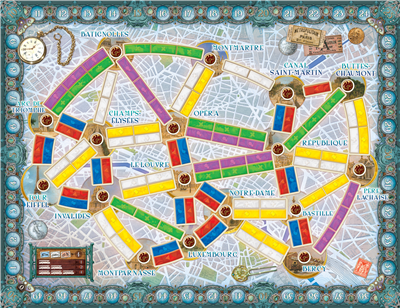 In dit snelle Ticket to Ride-spel racen spelers tegen elkaar om de meest iconische locaties van de prachtige Franse hoofdstad te bezoeken en hun bestemmingskaarten te voltooien.