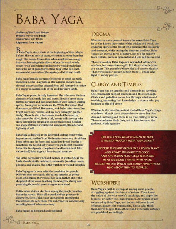 These are contemporary portrayals of deities from cultures from around our real world that can be inserted into any 5th edition campaign setting. What better way to add some vibrant diversity to such a wonderful game? Certainly, some of the names will be familiar like Freyja and Baba Yaga, but many are lesser-known deities providing new content for your game. This is your world where you and your players can find out how these new Gods and Goddesses will have an impact beyond what has ever been seen before.