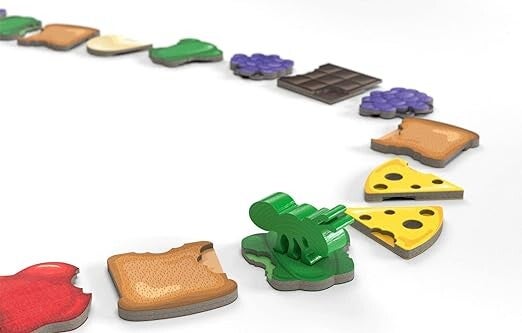 During setup, a trail of food is laid out. On each player's turn, they can move any ant to the next food in the trail that matches their color (red ant to apple, purple ant to grapes, etc). Then the player takes the food token directly in front of or behind the ant, saving it to score at the end of the game.