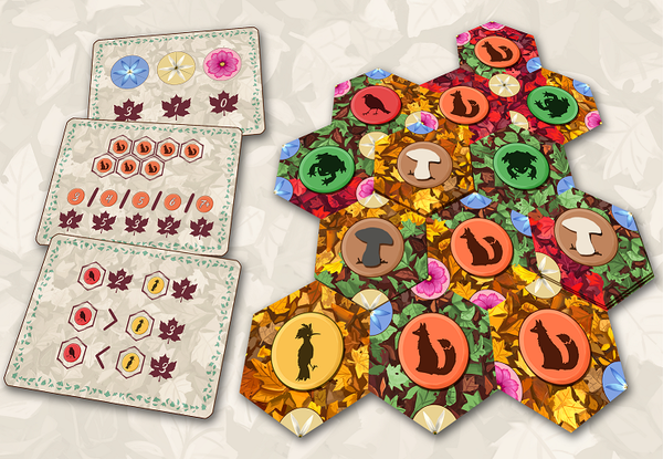 In Fall you create, together with your opponent, an autumn ecosystem. You both place leaves tiles in the same environment to grow the forest and host its flora, fauna, and funga. However, each player scores points for different objectives, and only at the end of the game the opponent's scoring conditions will be revealed, thanks to the Fox, Bird, and Flower scoring cards, which are different for each player in each game.