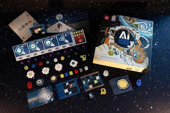 AI Space Puzzle is a co-operative board game in which most players take on the role of people who have been evacuated from Earth on spaceships and one player performs as a distressed AI that has partially malfunctioned.