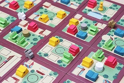 In more detail, the city of Chandigarh is represented by a 4x4 grid of sector tiles, with each sector having multiple plots. These sectors intersect at junctions, with the edges of these tiles creating streets between the sectors. You each start with a project card that shows an arrangement of buildings, along with two different colored buildings from the four colors available; your architect starts on a junction in the city.