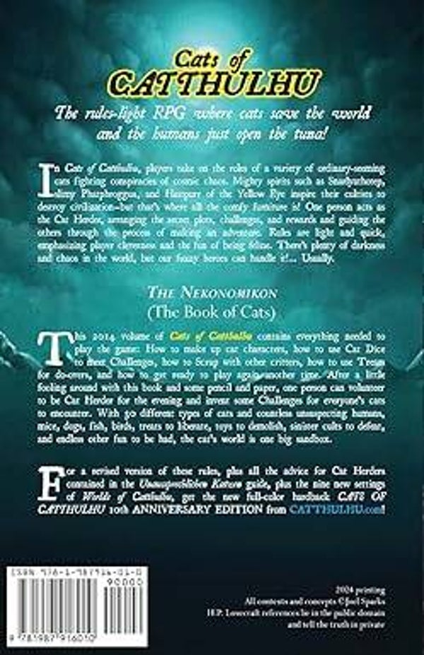 In Cats of Catthulhu, players take on the roles of a variety of ordinary-seeming cats fighting conspiracies of cosmic chaos. Mighty spirits such as Snarlyathotep, slimy Phatphroggua, and Hastpurr of the Yellow Eye inspire their cultists to destroy civilization-but that's where all the comfy furniture is! One person acts as the Cat Herder, arranging the secret plots, challenges, and rewards and guiding the others through the process of making an adventure. Rules are light and quick, emphasizing player cleverness and the fun of being feline. There's plenty of darkness and chaos in the world, but our fuzzy heroes can handle it!... Usually.