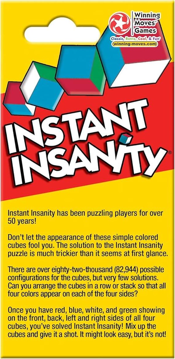 - IT'S BACK!: Originally produced in the 1960's, Instant Insanity is back to tease and train your brain. Can you solve it?
