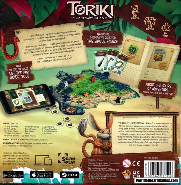 Toriki: The Castaway Island is a cooperative family game of adventure, exploration and survival. Using Scan & Play technology to mix digital elements with a traditional board game, it offers an immersive, interactive experience enriched with beautifully illustrated components. Search the island for resources, craft new tools, discover species unknown to science and name them! But most of all, secure your survival and find a way to return home!