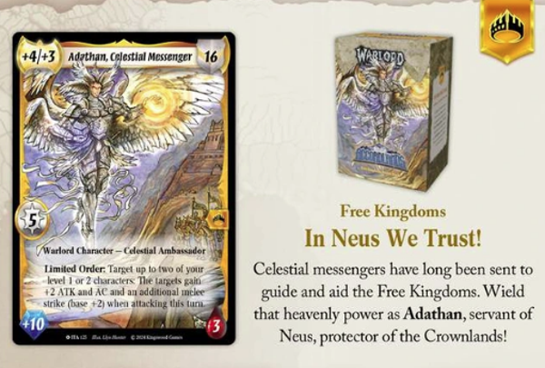 Warlord is known as “the game you already know how to play” due to its use of a d20 and popular TTRPG mechanics. Players build their decks around a Warlord and starting army, commanding their forces in snappy back and forth turn actions using a d20 to resolve spells, attacks, and abilities.
