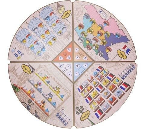 Fromage is a simultaneous worker-placement game where players place Workers to make cheese and gather resources from the quadrant of the board facing them. Once all players have placed their Workers, the board rotates, aging any cheese that was made, and presenting each player with a new quadrant to place Workers into. Score Prestige Points by selling cheese to the four locations, and by efficiently managing and upgrading your creamery.