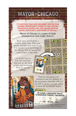 Mayor of Chicago is a solitaire game of tight management and tough choices. Each turn, you draw a city card and decide whether you want to use it to expand your knowledge of the Windy City (by laying this card as part of the map), or hire the assistant depicted on the back of the card to benefit from their special power or scoring abilities. Only by managing shrewdly your resources and the powers of the assistants will you be able to gather enough votes to be elected.