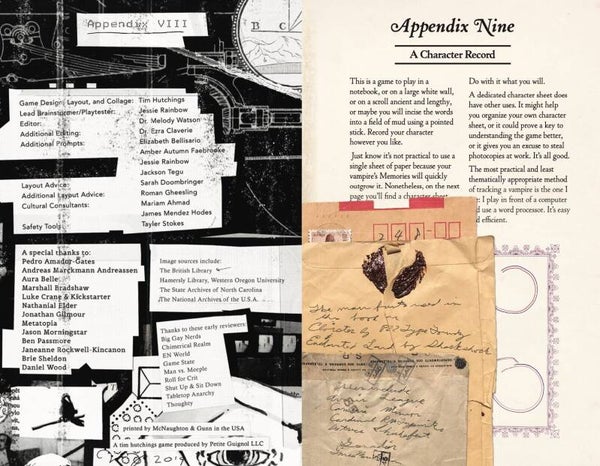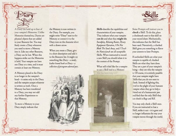 The game mechanics are simple and intuitive. Play progresses semi-randomly through a book of Prompts which let you explore your vampire’s wants and needs, resolve problems, and chart the decline into senescence. Play can happen entirely within the character sheet or can become a journaling activity--both work equally well.