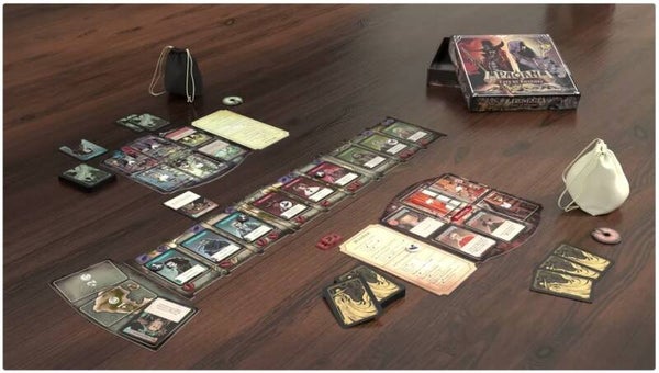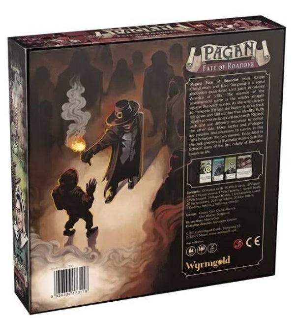 Pagan: Fate of Roanoke from Kasper Kjær Christiansen and Kåre Werner Storgaard is a deduction expandable card game set in colonial America of 1587. The essence of the asymmetrical game is the witch's struggle against the witch hunter. As the witch strives to complete a ritual, the hunter tries to track her down and find out her true identity.