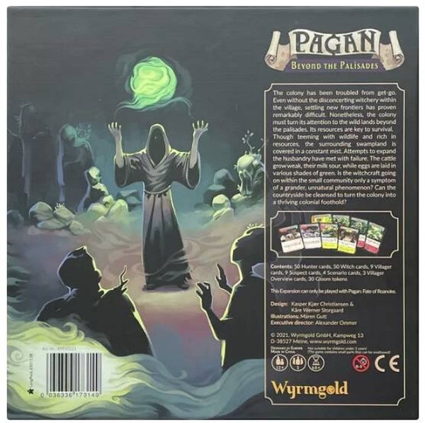 Pagan is an asymmetrical card game for two players taking on the roles of Witch or Witch hunter. The Witch tries to carry out a ritual of renaturation before being exposed and eliminated by the Witch hunter. Nine villagers are under suspicion and only the Witch player knows who the real Witch is. Each turn, the players use their action pawns on active villagers to draw cards, play cards, gain influence and manage the Gloom. Moreover, the Witch can brew powerful potions, improve their familiar and cast enchantments and charms, while the Witch hunter enlists allies, claim strategic locations, and ruthlessly investigates the villagers.