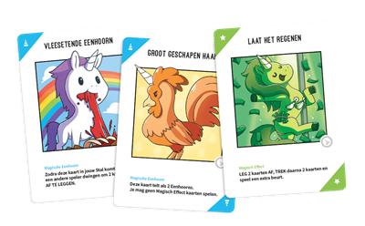 Probeer als eerste speler 7 eenhoornkaarten in jouw ‘stal’ (voor je op tafel) te verzamelen. Iedere speler begint het spel met 1 baby eenhoorn in hun stal en tijdens een speelbeurt mag je ofwel een eenhoorn uit je handkaarten in je stal leggen ofwel effectkaarten spelen om je tegenstanders dwars te zitten. Zo kun jij bijvoorbeeld eenhoorns uit iemands stal verwijderen of iedereen een eenhoorn laten afleggen etc. Bij 2-5 spelers is 7 eenhoorns voldoende voor de winst! Bij 6-8 spelers is 6 eenhoorns voldoende om te winnen.