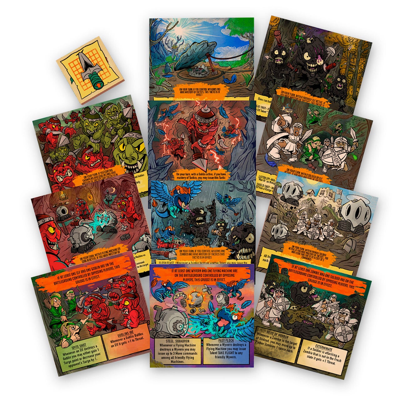 In Token Terrors: Battlegrounds, two players each draft an army of 10 Token Terrors from a variety of factions, and use them to completely eliminate their opponent's army on the 7x7 battleground grid. Through strategic movement, well-timed attacks and clever use of each factions' unique abilities, one army will conquer the Battleground, and reign victorious.
