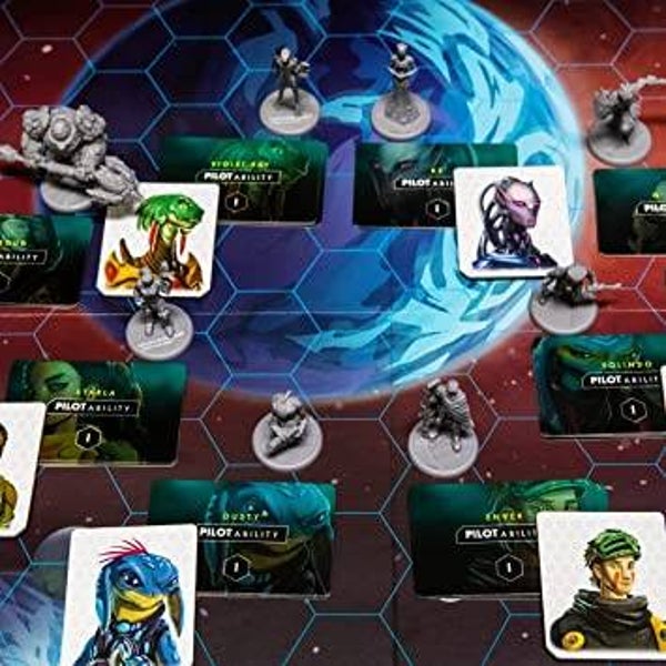 The 200 page scenario book unfolds as a "choose-your-own-adventure." Each choice, success, and failure will shape your story. It will take multiple play-throughs to see all of the Akarios galaxy. 8 different pilots each come with their own unique progression pad and set of skills. The campaign starts with 4 available pilots and the others are unlocked through the choices you make. 10 pilot ships each come with their own set of abilities and class. The ship class will determine what type of upgrades the ship can equip. Equip a combination of upgrade and ability cards from over 55 weapon cards, 55 engine cards, 55 tech cards, many co-pilots, ship abilities, and pilot abilities. Slot in each upgrade in your dual-layered playerboard where everything has a home.