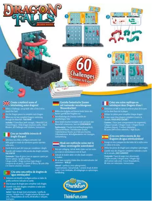 Includes 1x Game Base, 1x Waterfall Grid, 7x Coral Dragon Segments, 7x Teal Dragon Segments, 60x Challenges and Solutions. Suitable for ages 8 years and up. ThinkFun is the world’s leader in addictively fun games that stretch and sharpen your mind. From lighting up young minds to creating fun for the whole family, our innovative games make you think while they make you smile.