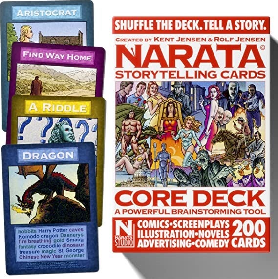 200 fully illustrated cards display a variety of characters, situations, locations, etc. A few cards picked at random can suggest surprising story possibilities that may not otherwise occur to you. Narata can also be used to methodically brainstorm and develop complete three-act stories from scratch. You find suggestions for working with Narata in the 24 page booklet.