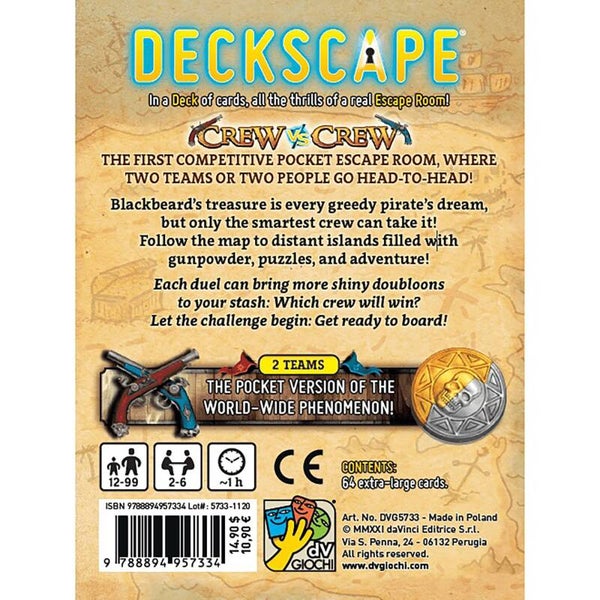 Deckscape Crew vs Crew: Pirates' Island differs from other Deckscape titles by adding a competitive element to the game! Players split into two teams and try to correctly solve the puzzles before the other team does. This chapter also features puzzle-based mini-games specially designed for a competitive experience.