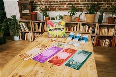 Challengers! is an interactive deck-management game for 1-8 players that plays in about 45 minutes independent of player count. With the tournament gameplay style, you meet another opponent every round.