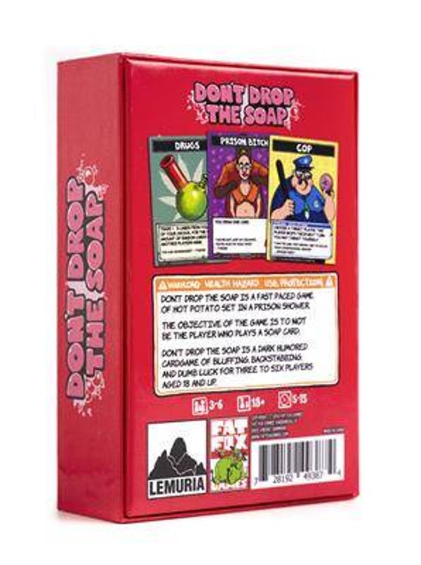 Don’t Drop The Soap is a dark humored, fast-paced card game of hot potato set in a prison shower. Players take the role of prison inmates who are, literally, trying to screw each other over. The objective of the game is to not be the player who drops the soap.