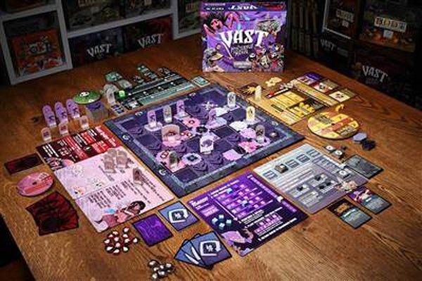 Leder Games will present the entire game with solo modes, many combinations of characters, and full games. For the first time Vast will come with a board, to hold the tiles that form the Manor. In addition Vast: The Mysterious Manor will be compatible with Vast: The Crystal Caverns and Vast: The Fearsome Foes.'