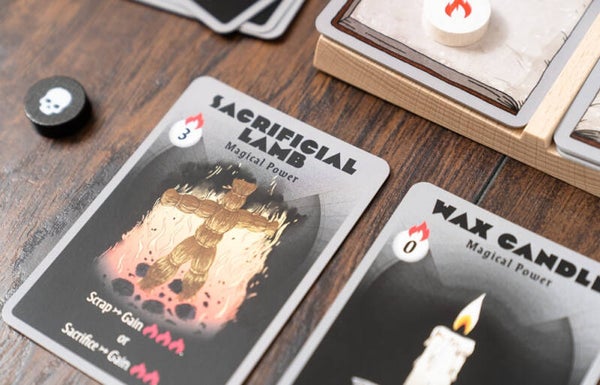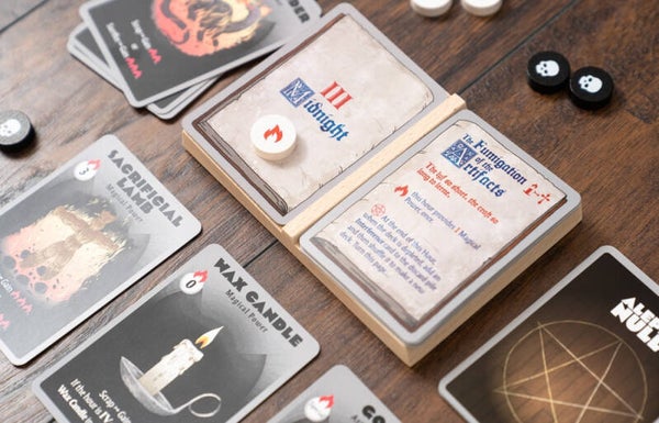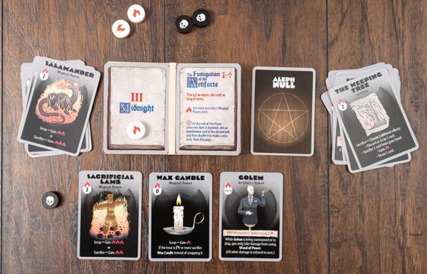 Inspired by the Black Easter novellas by James Blish, the aim of Aleph Null is to successfully summon the demonic Prince Baphomet who, when he appears, expects there to be no cards in your hand, the main deck and the discard pile; if there are any cards remaining in these ‘zones’, you lose. However, ‘not losing’ in this way doesn’t mean that you have won: any cards still in play also count against you – too many and you shall lose also. The sooner you ‘win’, the better your chance of surviving any due punishment.